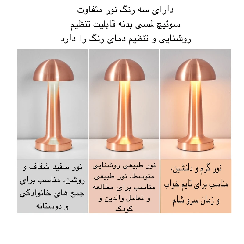سایر توضیحات: دارای سه رنگ نور متفاوت- سنسور لمسی در بالای چراغ- شدت نور قابل تنظیم