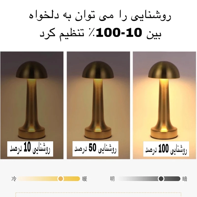 آباژور رومیزی شارژی با توان 5 وات رنگ نور 3500 کلوین، موجود می‌باشد. زیبایی و سایز مناسب این امکان را فراهم می‌آورد تا از این چراغ دکوراتیو علاوه بر نورپردازی فضای داخلی، در نورپردازی فضای بیرونی مانند تراس و یا روی میز رستوران ها قابل استفاده باشد. مزیت های چراغ شارژی رومیزی: این چراغ شارژی توسط باتری لیتیومی 2500 MAH تغذیه شده و به وسیله شارژر پورت تایپ سی قابل شارژ می‌باشد.این دستگاه دارای سه طیف نور می باشد نور طبیعی نور سفید و نور زرد که با تاچ قسمت بالایی آباژور قادر به تغییر رنگ آن هستید و با نگه داشتن آن قسمت می توانید نور را کم یا زیاد کنید. شما می توانید با 5 تا 7 ساعت شارژ دستگاه ، به مدت حداقل 6 تا 8 ساعت از نور دلنشین آن در فضاهای دلخواه خود بهره مند شوید. بدنه مقاوم و بسیار با کیفیت آباژور سهولت در جابجایی را نیز می توان از دیگر نقاط قوت این محصول دانست.