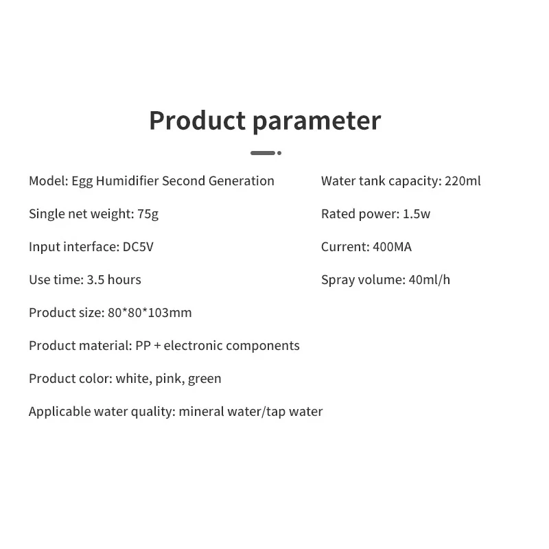 این دستگاه بخور سرد با طراحی و رنگ بندی زیبای خود و منبع تغذیه USB گزینه ای عالی برای محیط های کوچک است، خروجی بخار مناسب و ظرفیت 220ml قابلیت تولید بخار تا 3.5 ساعت را به این دستگاه داده است. از دیگر ویژگی های آن می توان به خاموشی خودکار و چراغ LED اشاره کرد. قبل از استفاده در بار اول فیلتر را از دستگاه جدا کرده و برای مدتی در آب قرار دهید و مجدد به دستگاه متصل کنید. فشار دکمه برای بار اول منجر به روشن شدن، بار دوم حالت بخار را به صورت 4 ثانیه بخار و 6 ثانیه متوقف و بار سوم خاموش شدن دستگاه می شود.