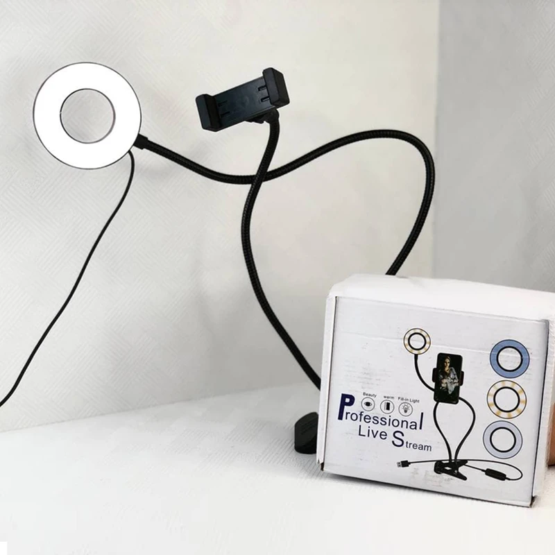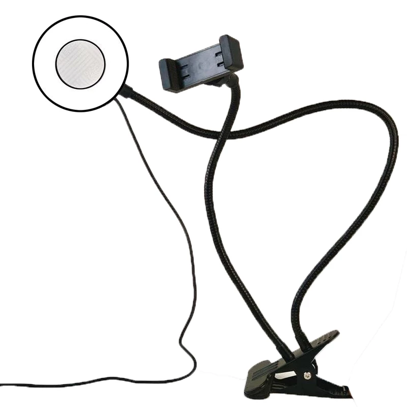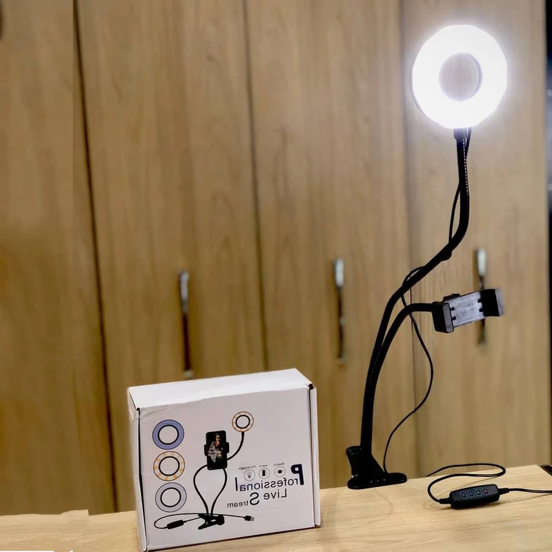 رینگ لایت رو میزی گیره ای مخصوص میزهای شخصی- اداری و مراسمات میباشد این رینگ لایت توسط گیره به میز و یا جای مورد نظر وصل شده و دارای یک عدد گیره – یک عدد هولدر موبایل -و یک رینگ لایت دارای سه حالت آفتابی- مهتابی و سفید یخی میباشد این کالا دارای ریموت متصل بوده که برای تغییر حالت نور و اندازه ی نور آن قابل استفاده میباشد. نحوه ی اتصال این رینگ لایت توسط usb بوده که حتی توسط پاوربانک نیز روشن میشود.