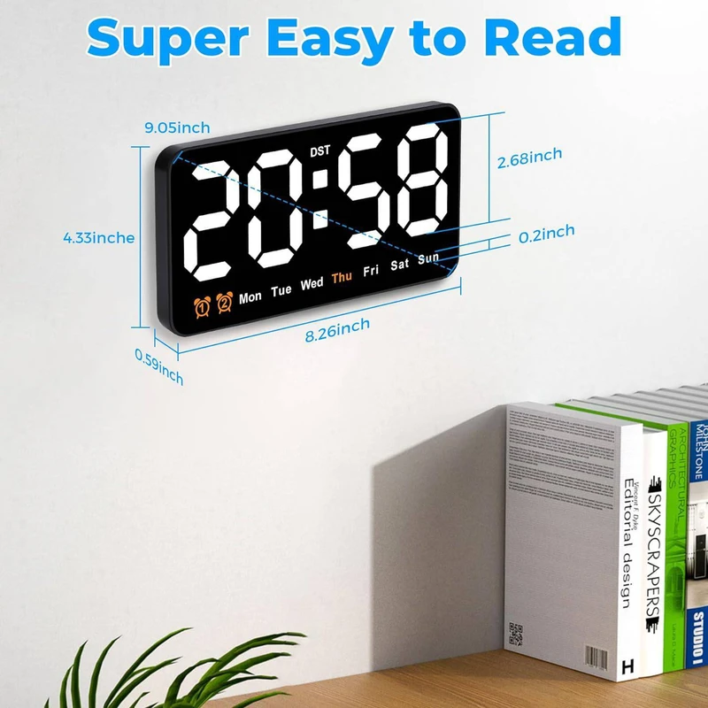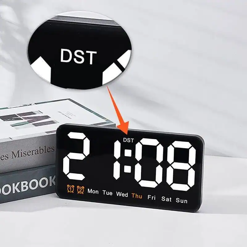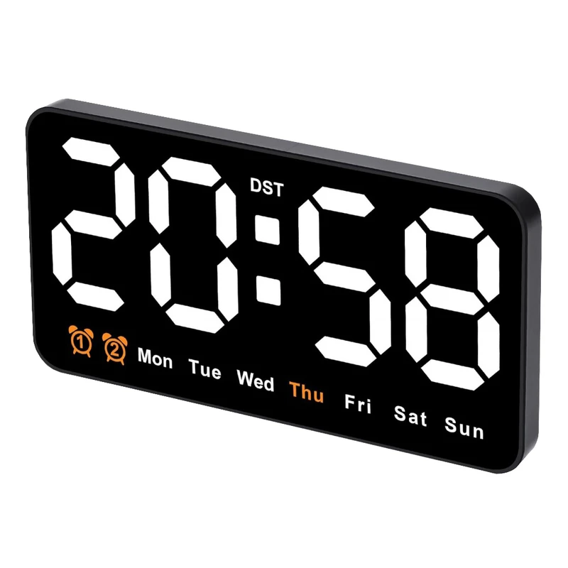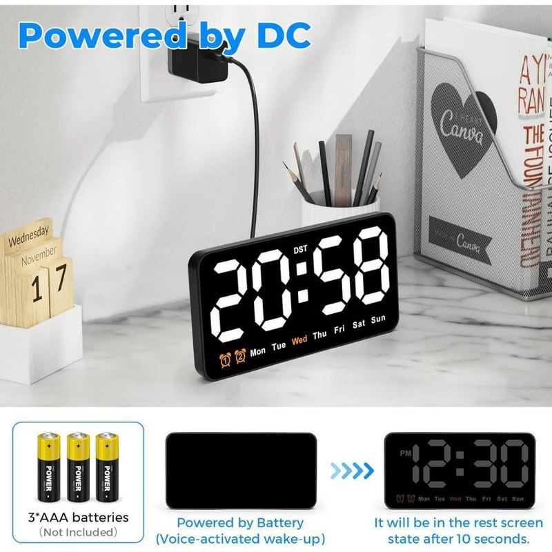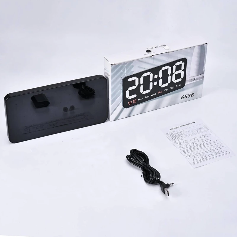 ساعت دیجیتال نانو LED دیواری و رومیزی 21 سانتیمتری مدل DS-6638 – بدنه مشکی – نور نئونی سفید رنگ زیبا و چشم نواز بدون تیزی و اذیت چشم – قابلیت انتخاب حالت نمایش (فقط نمایش ساعت و تقویم هفتگی یا نمایش ساعت + تاریخ روز و ماه میلادی + دمای محیط بصورت پلکانی و ترتیبی) – نمایش روز هفته میلادی با رنگ نارنجی (حروف اختصاری روزهای هفته میلادی)- نمایش دمای تقریبی محیط – نمایش عدد روز و ماه میلادی – قابلیت کم و زیاد کردن نور در 3 درجه مختلف – قابلیت انتخاب کاهش میزان نور بصورت اتوماتیک هنگام شب (ساعت 10 شب تا 6 صبح) – فعال شدن اتوماتیک سنسور صوتی (خاموشی اتوماتیک صفحه نمایش پس از 10 ثانیه) فقط به هنگام استفاده از باطری (جهت مصرف کمتر انرژی) – خواندن راحت و آسان حتی از فاصله – دارای 2 آلارم بیدارباش (2 الارم برای 2 زمان مختلف) – دارای قابلیت DST یا Daylight Saving Time یا تنظیم اتوماتیک ساعت زمستانه و تابستانه (نگهداشتن دکمه -) . قابلیت کارکرد با آداپتور USB یا پاوربانک (در بسته بندی نیست) یا هر منبع برق USB قابلیت کارکرد با 3 عدد باطری نیم قلمی (به دلیل مصرف تقریبا بالای انرژی و کم شدن نور استفاده از باطری در این مدل ساعت اصلا توصیه نمیشود، در صورت لزوم حتما از باطریهای تاریخ جدید پرانرژی استفاده کنید، توجه: در صورت استفاده از باطری ساعت به حالت مدیریت مصرف خواهد رفت و نور صفحه نمایش ساعت هنگام بیکاری و سکوت محیط بصورت اتوماتیک پس از ده ثانیه خاموش خواهد شد و اگر ضربه ملایمی به بدنه ساعت بزنید یا صدایی در محیط نزدیک ایجاد شود صفحه نمایش روشن میشود). در کل اگر میخواهید صفحه نمایش همیشه روشن باشد از کابل USB استفاده کنید. صفحه نمایش و فونت های تقریبا بزرگ نوری LED های این ساعت رویت و خواندن آنرا حتی از دورترین نقطه یک اتاق فراهم میکند.این ساعت با قابلیت تعریف 2 زمان آلارم مختلف میباشد، یعنی شما میتوانید برای چند زمان مختلفی که دوست دارید آلارم و زنگ تعیین کنید تا موقع سررسید آن ساعت و زمان این ساعت شروع به پخش موزیک زنگ کند و شما را باخبر کند(شما در اکثر مدلهای دیگر ساعتهای رومیزی فقط یک زمان برای زنگ زدن میتوانستید تنظیم کنید).از این قابلیت میتوانید برای باخبر شدن از سررسید وقت جلسات یا کلاس و باشگاه و مدرسه بچه یا کارهای روزمره مختلف خودتان استفاده کنید.
