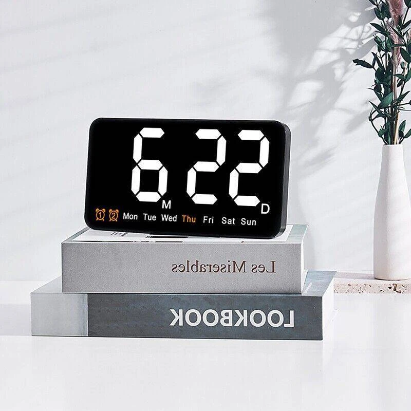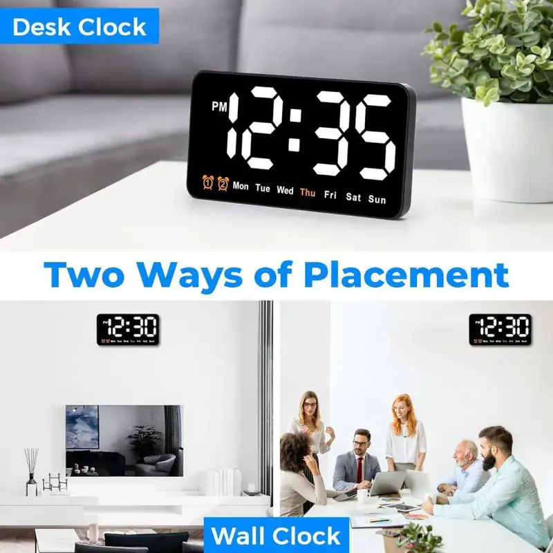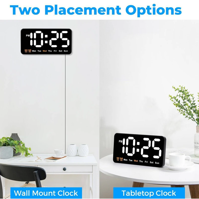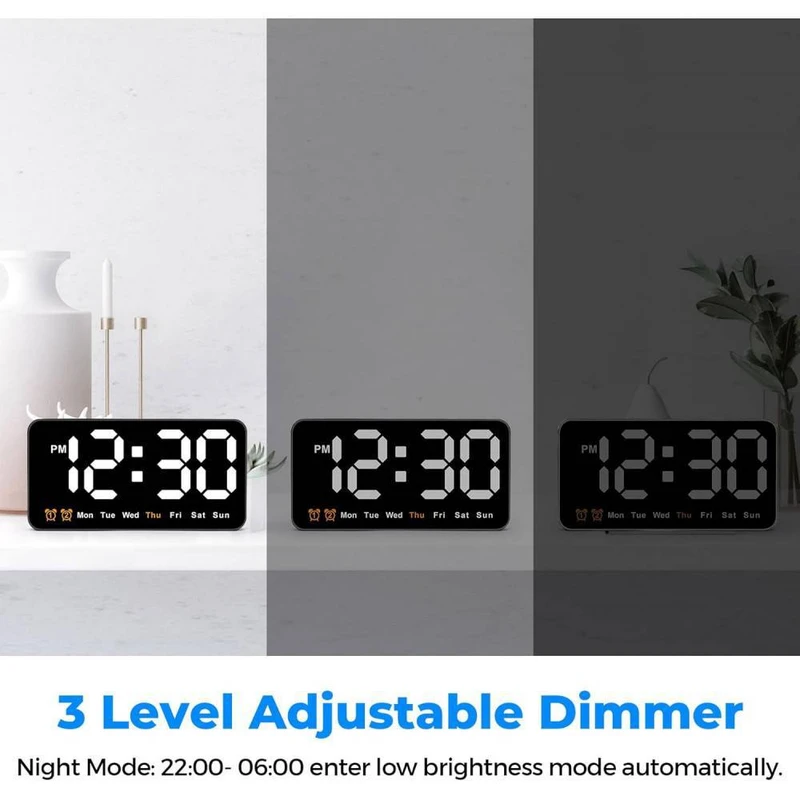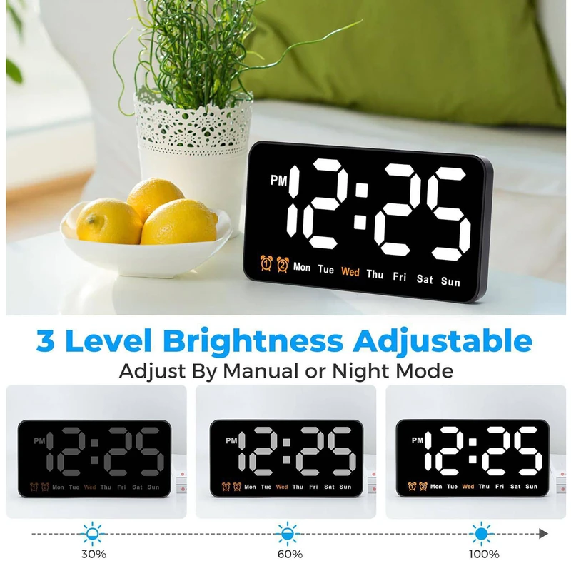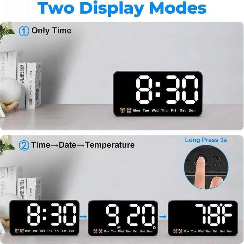 ساعت دیجیتال نانو LED دیواری و رومیزی 21 سانتیمتری مدل DS-6638 – بدنه مشکی – نور نئونی سفید رنگ زیبا و چشم نواز بدون تیزی و اذیت چشم – قابلیت انتخاب حالت نمایش (فقط نمایش ساعت و تقویم هفتگی یا نمایش ساعت + تاریخ روز و ماه میلادی + دمای محیط بصورت پلکانی و ترتیبی) – نمایش روز هفته میلادی با رنگ نارنجی (حروف اختصاری روزهای هفته میلادی)- نمایش دمای تقریبی محیط – نمایش عدد روز و ماه میلادی – قابلیت کم و زیاد کردن نور در 3 درجه مختلف – قابلیت انتخاب کاهش میزان نور بصورت اتوماتیک هنگام شب (ساعت 10 شب تا 6 صبح) – فعال شدن اتوماتیک سنسور صوتی (خاموشی اتوماتیک صفحه نمایش پس از 10 ثانیه) فقط به هنگام استفاده از باطری (جهت مصرف کمتر انرژی) – خواندن راحت و آسان حتی از فاصله – دارای 2 آلارم بیدارباش (2 الارم برای 2 زمان مختلف) – دارای قابلیت DST یا Daylight Saving Time یا تنظیم اتوماتیک ساعت زمستانه و تابستانه (نگهداشتن دکمه -) . قابلیت کارکرد با آداپتور USB یا پاوربانک (در بسته بندی نیست) یا هر منبع برق USB قابلیت کارکرد با 3 عدد باطری نیم قلمی (به دلیل مصرف تقریبا بالای انرژی و کم شدن نور استفاده از باطری در این مدل ساعت اصلا توصیه نمیشود، در صورت لزوم حتما از باطریهای تاریخ جدید پرانرژی استفاده کنید، توجه: در صورت استفاده از باطری ساعت به حالت مدیریت مصرف خواهد رفت و نور صفحه نمایش ساعت هنگام بیکاری و سکوت محیط بصورت اتوماتیک پس از ده ثانیه خاموش خواهد شد و اگر ضربه ملایمی به بدنه ساعت بزنید یا صدایی در محیط نزدیک ایجاد شود صفحه نمایش روشن میشود). در کل اگر میخواهید صفحه نمایش همیشه روشن باشد از کابل USB استفاده کنید. صفحه نمایش و فونت های تقریبا بزرگ نوری LED های این ساعت رویت و خواندن آنرا حتی از دورترین نقطه یک اتاق فراهم میکند.این ساعت با قابلیت تعریف 2 زمان آلارم مختلف میباشد، یعنی شما میتوانید برای چند زمان مختلفی که دوست دارید آلارم و زنگ تعیین کنید تا موقع سررسید آن ساعت و زمان این ساعت شروع به پخش موزیک زنگ کند و شما را باخبر کند(شما در اکثر مدلهای دیگر ساعتهای رومیزی فقط یک زمان برای زنگ زدن میتوانستید تنظیم کنید).از این قابلیت میتوانید برای باخبر شدن از سررسید وقت جلسات یا کلاس و باشگاه و مدرسه بچه یا کارهای روزمره مختلف خودتان استفاده کنید.