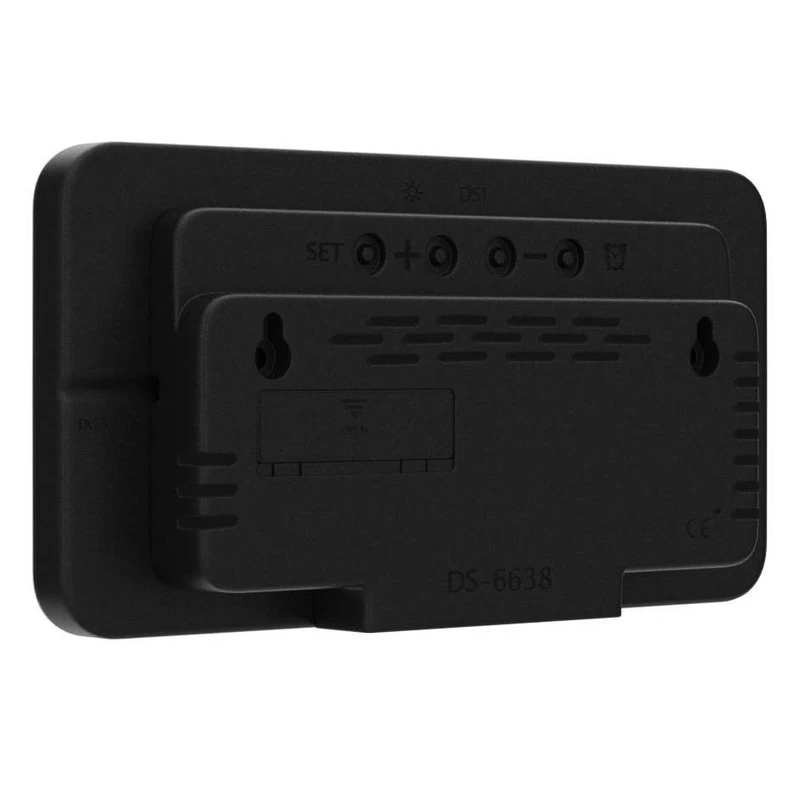 سایر ویژگی‌ها: مشخصات ساعت دیواری و رومیزی دیجیتال مدل دی اس-۶۶۳۸: جنس بدنه: پلاستیک- نوع ساعت: دیجیتال- رنگ قاب و بدنه: مشکی- رنگ نور LED: سفید مایل به آبی روشن (روزهای هفته و آیکن آلارم ها به رنگ نارنجی)- پترن: افقی اندازه: حدود ۲۸x۱۱۰x۲۱۳ میلیمتر- وزن: حدود ۳۵۰ گرم