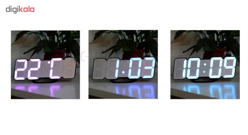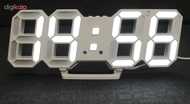 این محصول یک ساعت سگمنتی 3 بعدی LED است. فونت های بزرگ نوری قوی LED های این ساعت ، رویت و خواندن آنرا حتی از دورترین نقطه یک اتاق یا سالن معمولی فراهم میکند. همچنین شما می توانید میزان نور ساعت را در سه سطح مختلف کم یا زیاد کنید. این محصول دارای تقویم، دماسنج بوده و میزان دمای محیط را به صورت دیجیتال و برحسب درجۀ سانتیگراد نمایش می دهد.همچنین دارای قابلیت آلارم با حالت چرت 5 تا 60 دقیقه می باشد. و زمان را به صورت 12 ساعته یا 24 ساعته میتواند به شما نمایش دهد. انرژی مورد نیاز این ساعت را میتوانید بوسیله برق 5 ولت تامین کنید (کابل USB برای این منظور داخل جعبه گذاشته شده است) و میتوانید این کابل را به پورت USB کامپیوتر یا لپ تاپ بزنید یا اینکه با تهیه و خرید آداپتور یو اس بی شهری آنرا استفاده کنید (از مغازه های الکتریکی یا لوازم موبایل با قیمتی مناسب می توانید تهیه کنید، البته میتوانید از آداپتورهای USB که اکثر موبایلهای جدید جهت شارژ خود دارند نیز استفاده کنید). که رنگ قاب ساعت سفید یا مشکی می باشد . خصوصیات اصلی: سه دکمه روی محصول: mode, down, up چهار نمایشگر دیجیتالی چهار حالت روشنایی: 1- روشنایی زیاد 2-روشنایی متوسط 3-روشنایی کم 4- روشنایی در حالت اتوماتیک نشان دهنده تاریخ مجهز به سیستم آلارم دارای دماسنج بین 0-50 درجه سانتی گرد قابلیت تعویض از حالت سلسیوس به فارنهایت دارای باطری CR2032 جهت به خاطر داشتن تنظیمات ساعت در زمان های قطعی برق عملکرد ریست: فشار دادن دکمه ی UP و DOWN به صور همزمان با هم و نگه داشتن آن بمدت 3 ثانیه برق مورد نیاز: 5V عملکرد: بعد از روشن کردن ساعت با استفاده از آداپتور صفحه ی نمایشگر بسرعت و با صدایی شروع به شمار از 0000 به 9999 میکند. موارد پیش فرض: زمان بصورت 24 ساعته است و در حالت 00:00 می باشد. میزان روشنایی در حالت متوسط وضعیت آلارم در خالت خاموش دماسنج: برای نمایش دماسنج با فشار دادن دکمه ی MOOD میتوان وضعیت نمایشگر را در حالت های مختلف (( تاریخ نما، زمان، آلارم نما، دماسنج نما و یا در حالت چرخشی که هرکدام از حالت ها در بازه ی زمانی کوتاهی نمایش داده شود)) قرار داد.