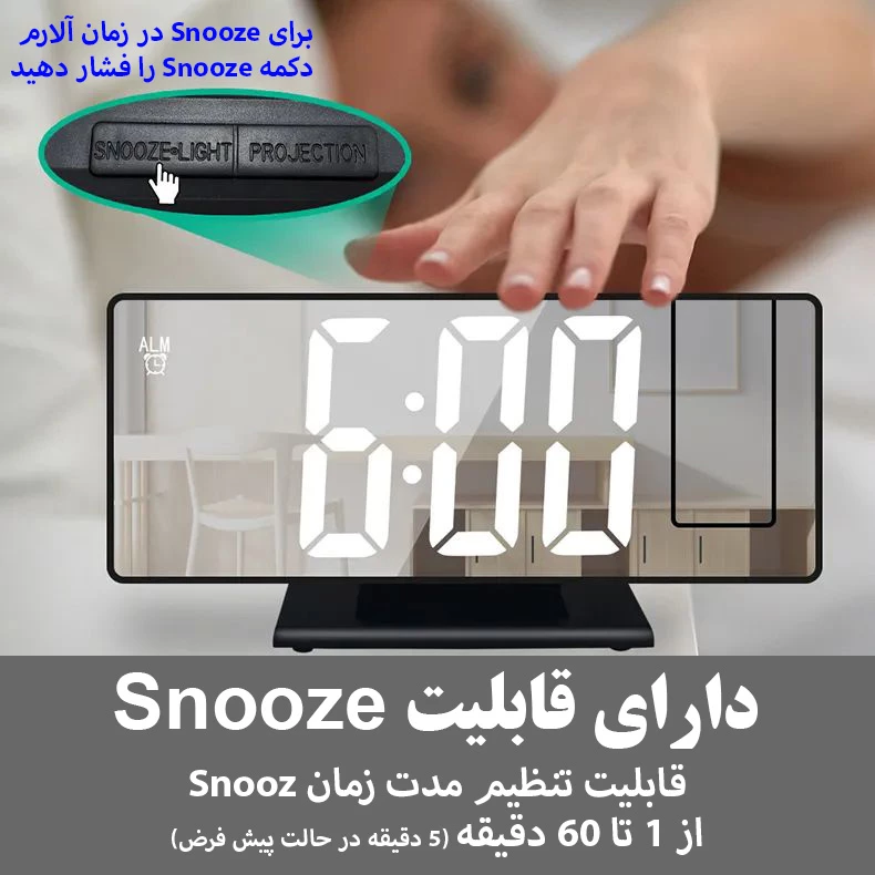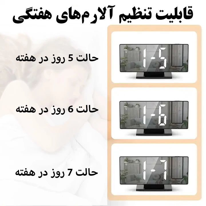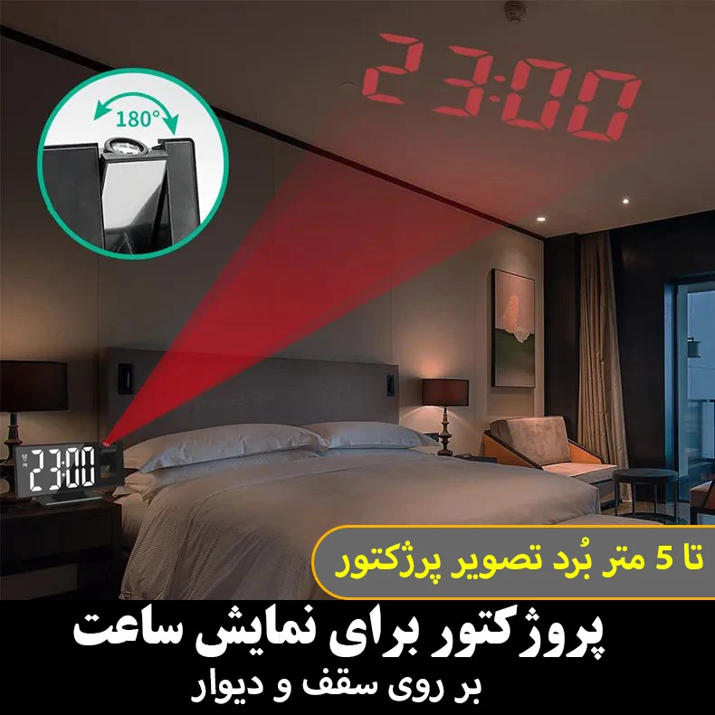 سایر توضیحات: دارای پرژکتور برای نمایش ساعت بر روی دیوار دارای سنسور دمای هوا نمایش تاریخ و دمای هوا قابلیت snooze نمایش ساعت در دو حالت ۱۲ ساعته و ۲۴ ساعته صفحه نمایش آینهای قابلیت تنظیم نور صفحه دارای حالت شب (کاهش خودکار نور در شب) قابلیت تنظیم آلارم های هفنگی (۵، ۶ و ۷ روز در هفته)