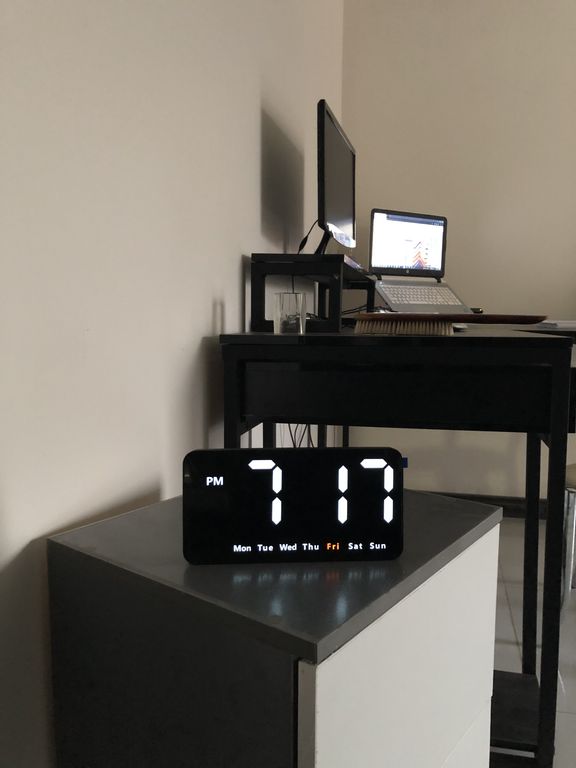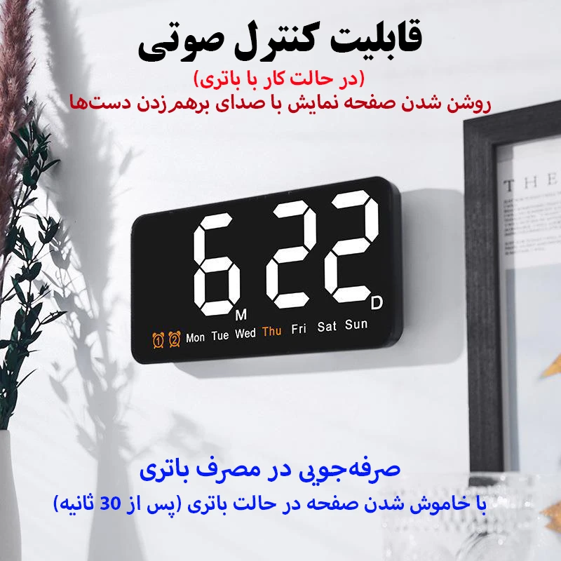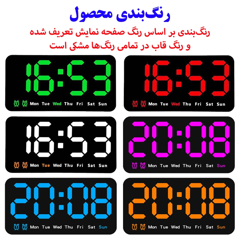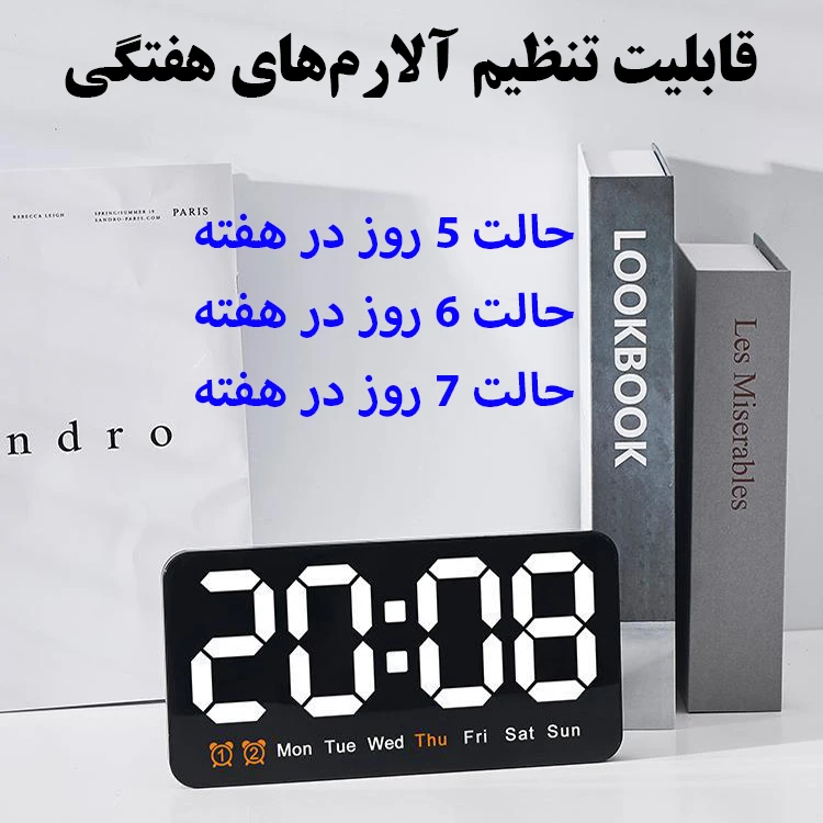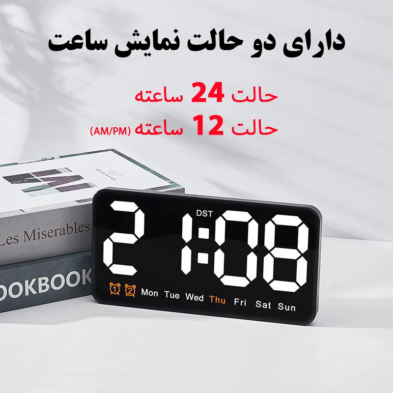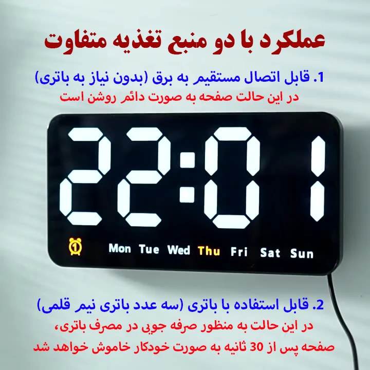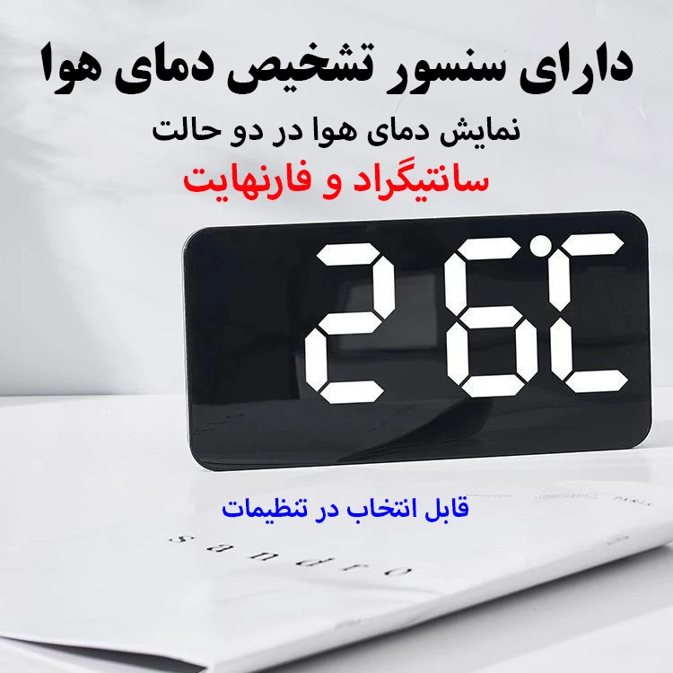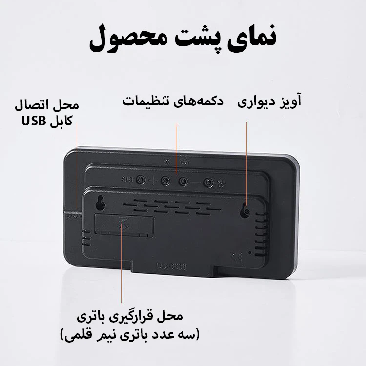 سایر توضیحات: دارای سنسور دمای هوا – نمایش تاریخ – قابلیت تنظیم ۲ مجموعه آلارم کاملا مجزا – قابلیت تنظیم نور صفحه نمایش به صورت دستی و اتوماتیک – دارای حالت ذخیره انرژی- قابل استفاده به عنوان رومیزی و دیواری – امکان استفاده با کابل USB و یا ۳ عدد باتری نیم قلمی – قابلیت DST برای یک ساعت جلو یا عقب بردن ساعت در شروع فصل های بهار و پاییز