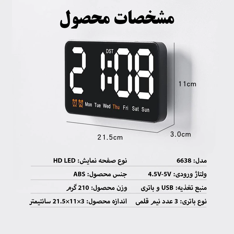 ساعت مدل 6638 یک ساعت دو منظوره برای استفاده رومیزی و دیواری است. صفحه نمایش این محصول از نوع HD LED بوده و با نمایش بزرگ اعداد، اطلاعات روی صفحه نمایش از فواصل دور و از هر زاویه ای کاملا قابل خواندن هستند (زاویه دید 180 درجه ای). این ساعت علاوه بر نمایش ساعت، قابلیت نمایش تاریخ و همچنین با داشتن سنسور دما قابلیت نمایش درجه هوا را دارد. نمایش دمای هوا به دو صورت سلسیوس و فارنهایت قابل نمایش است (قابل انتخاب در تنظیمات). قابلیت تنظیم نور صفحه نمایش به صورت دستی (در سه درجه) و خودکار و قابلیت تنظیم 2 مجموعه آلارم کاملا مجزا از دیگر امکانات این محصول جذاب هستند. منظور از مجموعه آلارم این است که قابلیت ست کردن هر آلارم برای مجموعه ای از روزهای هفته (5 روز در هفته، 6 روز در هفته و یا 7 روز در هفته) وجود دارد. این محصول قابلیت استفاده به صورت اتصال مستقیم به برق با کابل USB و یا استفاده با 3 عدد باتری نیم قلمی را دارد تا دیگر دغدغهای در مورد نوع منبع تغذیه نداشته باشید. همچنین دارای حالت دخیره انرژی است که در حالت باتری میتواند به مصرف کمتر باتری بسیار کمک کند. یکی دیگر از امکانات بسیار جذاب این محصول قابلیت کنترل صوتی آن است که توسط می توانید با خاموش شدن صفحه نمایش در حالت ذخیره انرژی، تنها با صدای کف زدن دست ها صفحه نمایش ساعت را از فواصل نسبتا دور روشن کرد. این ساعت با طراحی و ظاهر زیبای خود میتواند زیبایی بخش میزکار و یا دیوار خانه شما باشد.