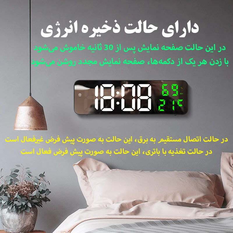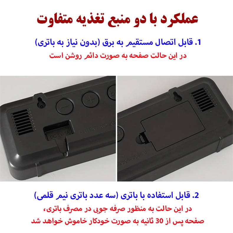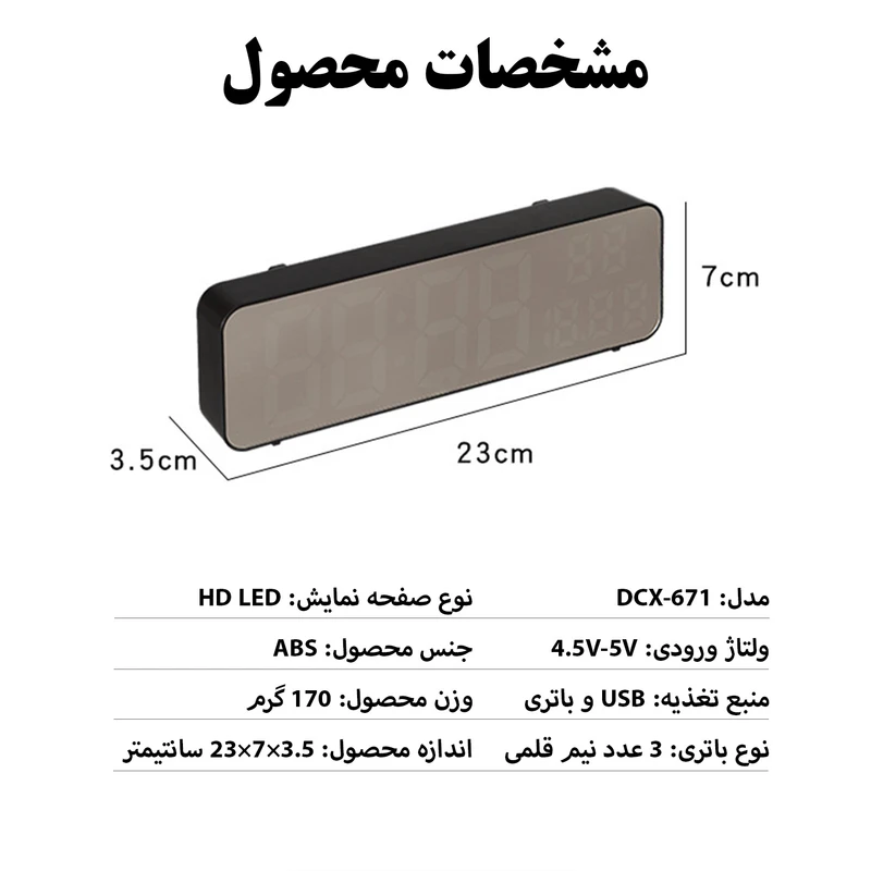 سایر توضیحات: دارای سنسور دمای هوا – دارای سنسور رطوبت هوا – نمایش تاریخ – قابلیت تنظیم ۳ آلارم کاملا مجزا – قابلیت تنظیم نور صفحه نمایش به صورت دستی و اتوماتیک – دارای حالت ذخیره انرژی- قابل استفاده به عنوان رومیزی و دیواری – امکان استفاده با کابل USB و یا ۳ عدد باتری نیم قلمی
