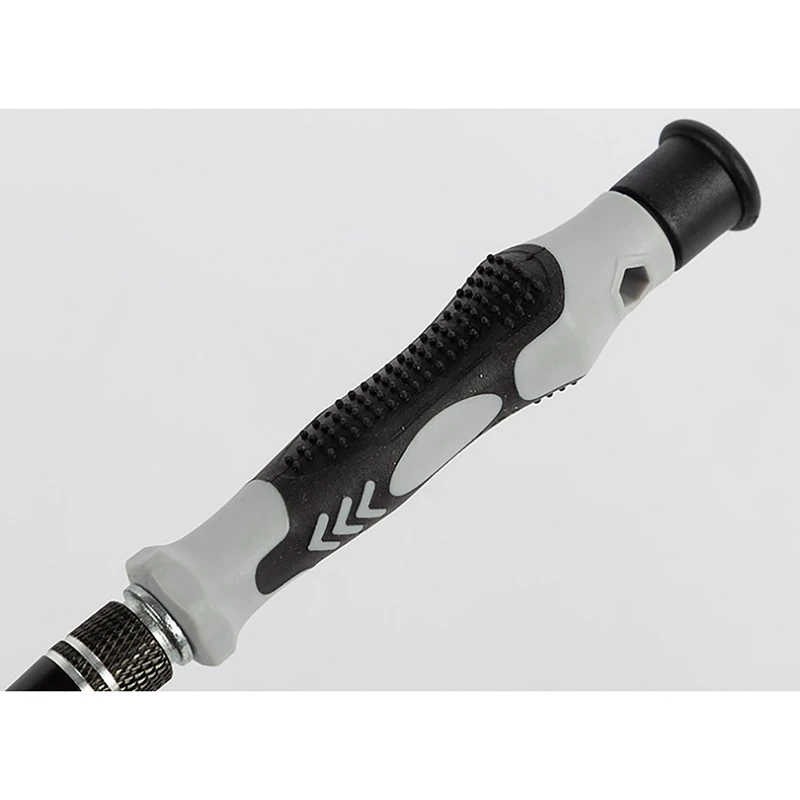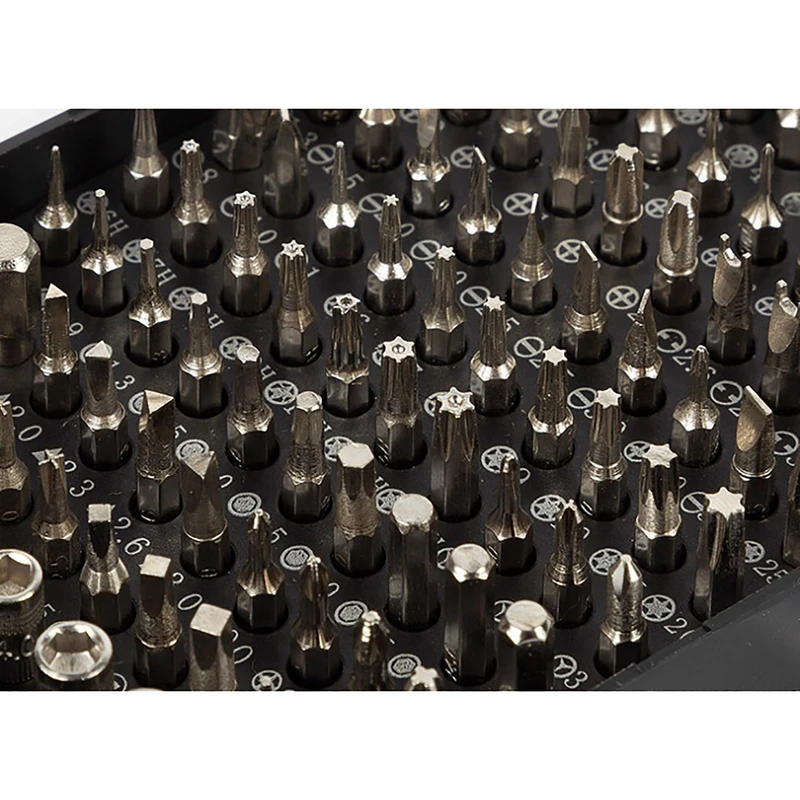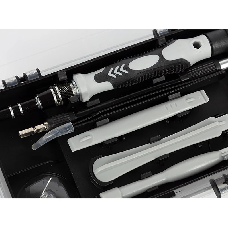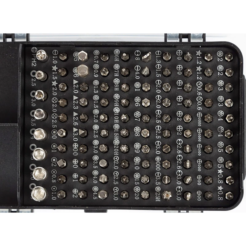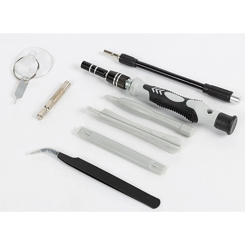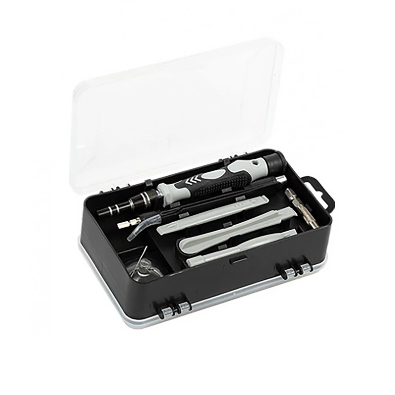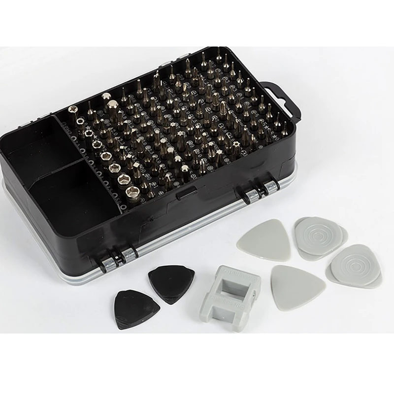 جنس دسته: پلاستیک جنس سری: فلز دارای ۹۸ سری مختلف دارای ۱۷ ابزار: ۱x handle ۱x Flexible extension shaft ۱x Extension bar ۱x Tweezers ۶x Plastic pry tools ۱x SIM card removal tool ۱x Magnetizer / Demagnetizer ۱x suction cup ۳x opening picks ۱x Bit holder for power screwdriver ابعاد تقریبی جعبه: ۱۵x۸x۵cm
