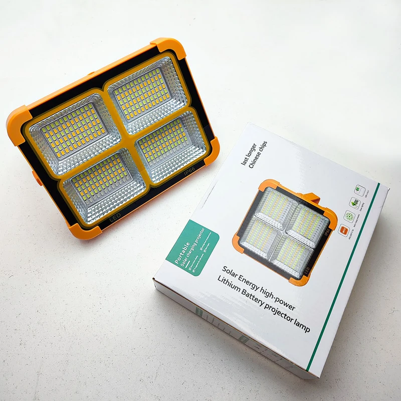 این چراغ شارژی یک نور افکن قوی و خوش ساخت با طراحی استاندارد است که مناسب روشنایی بیرونی در شب، برای کمپینگ، کوهنوردی، معدن، تعمیر ماشین، نگهبانی و… است. در ساخت این محصول از مواد بااستحکام پلاستیکی ABS استفاده شده است. تامین انرژی این چراغ قوه از طریق باتری داخلی قابل شارژ توسط پورت USB همراه با پنل خورشیدی است که به راحتی در صورت نبود برق با انرژی خورشیدی شارژ می شود. این چراغ قوه در صورت شارژ کامل حدود 4 ساعت با حداکثر روشنایی نوردهی می کند. بهره مندی از کلید فیزیکی بر روی بدنه به منظور روشن خاموش و تغییر حالات نوردهی از دیگر ویژگی های این محصول است و همچنین بهره مندی از پنل خورشیدی بر روی بدنه به منظور شارژ دستگاه، دارای پورت USB جهت شارژدهی (به عنوان پاوربانک) در مواقع اضطراری دارد. این چراغ قوه شارژی از چهار چیپ SMD پروژکتور تشکیل شده از در قسمت جانبی می باشد. مجهز بودن به دسته جهت حمل آسان تر، داشتن مگنت برای اتصال بر سطوح فلزی، غلاب آویز و بدنه کاملا ضد آب از مزیت های این محصول است.