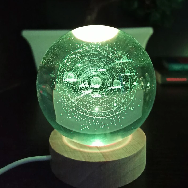 این چراغ خواب کریستالی به صورت سه بعدی و در طرح سیارات منظومه شمسی تولید شده که باعث جذابیت بیشتر اتاق خواب شما می شود. جنس این گوی شیشه ای از کریستال فشرده می باشد و همچنین دارای یک پایه چوبی و کابل برق USB می باشد.این چراغ خواب زیبا در دو رنگ ثابت و متغیر قابل دسترس است.